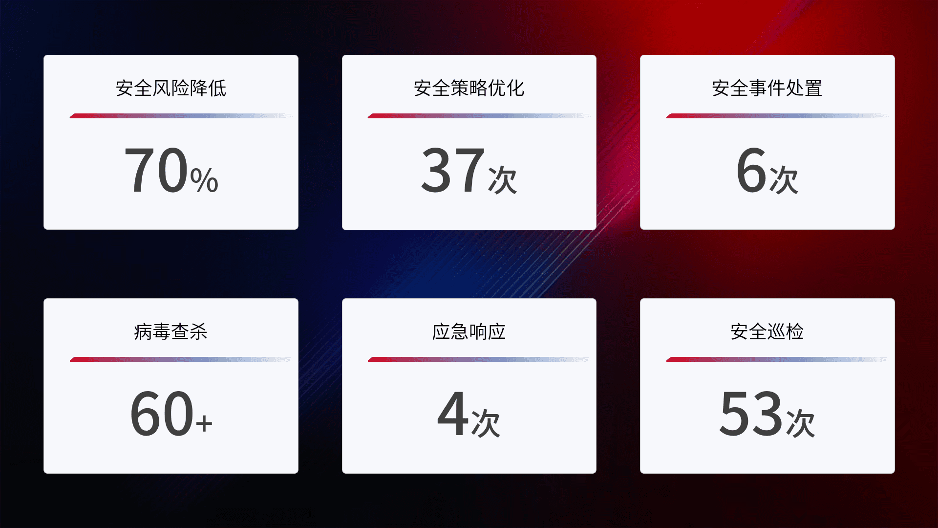 提供全面的安全事件报告体系,,包括处置报告、、、周报、、季度和年度总结,,,,结合持续监控,,,帮助客户深入了解网络安全状况。。。